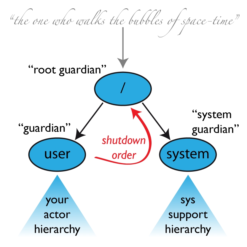 system.actorOf()를 호출해서 만드는 모든 actor가 이 actor의 자식으로 들어감만약에 이 guardian이 종료되면 모든 일반적인 actor들이 종료된다고 할 수 있음